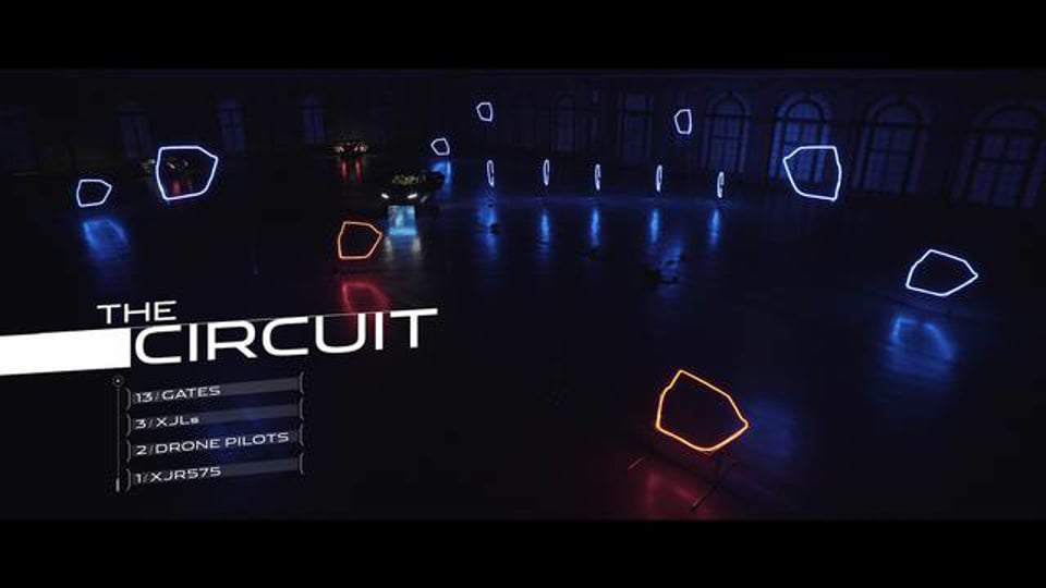 - Professional racers fly drones through rear cabins of three Jaguar XJL luxury sedans and 13 door‑shaped gates on unique circuit at Alexandra Palace in London