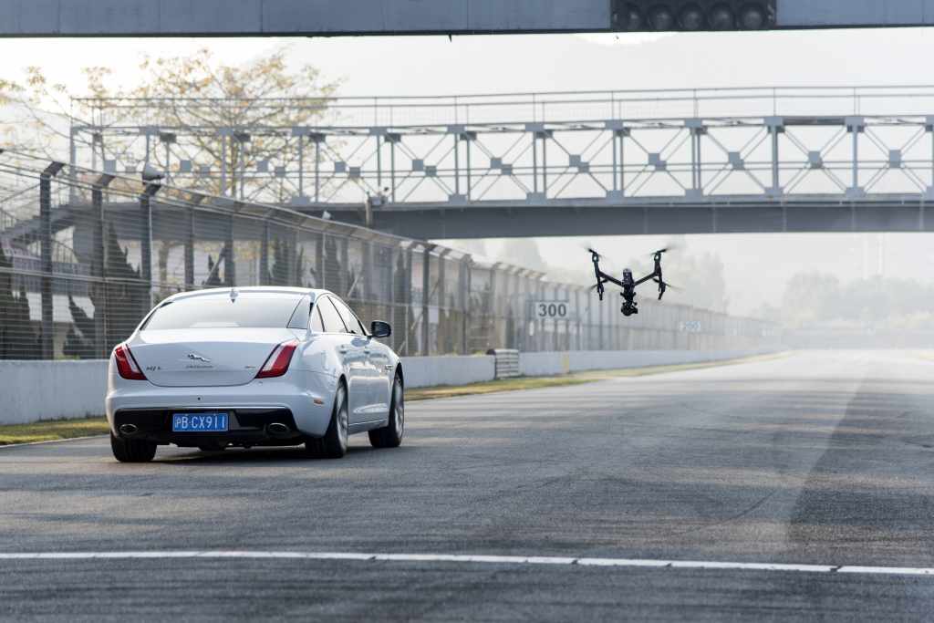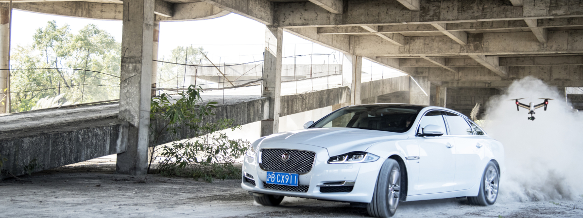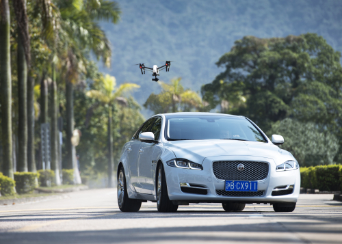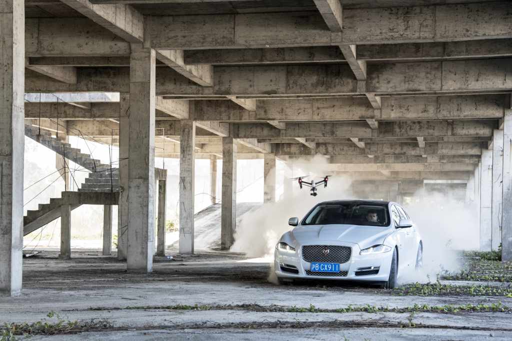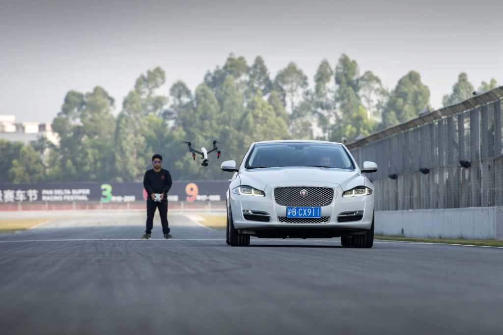 Zhuhai, le 17 mars 2016 : Une Jaguar XJ, conduite par le pilote cascadeur Mark Higgins, a affronté l'un des meilleurs pilotes de drone au monde au cours d'un défi inédit en jouant au 'chat et à la souris' pour montrer la façon dont la technologie pourrait à l'avenir influencer le tournage de courses‑poursuites au cinéma.