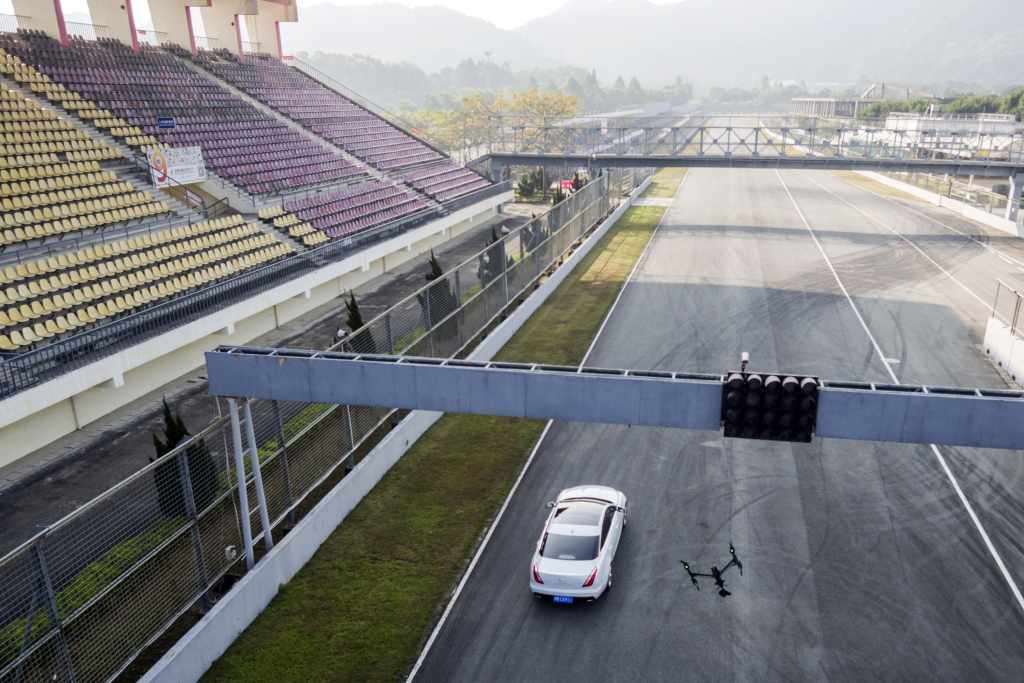 Le défi, qui a pris place sur le circuit international de Zhuhai en Chine, consistait pour Higgins à semer le drone dans une zone industrielle avec ses containers, sur des boulevards bordés d'arbres, dans des garages et un parking souterrain. La XJ a fait preuve d'une grande agilité et d'une parfaite maîtrise durant tout le défi.
